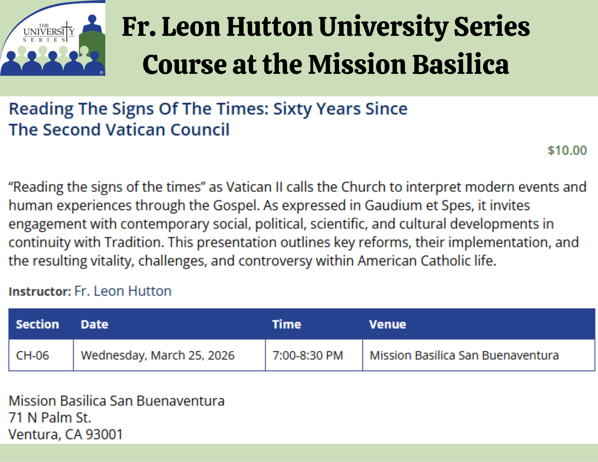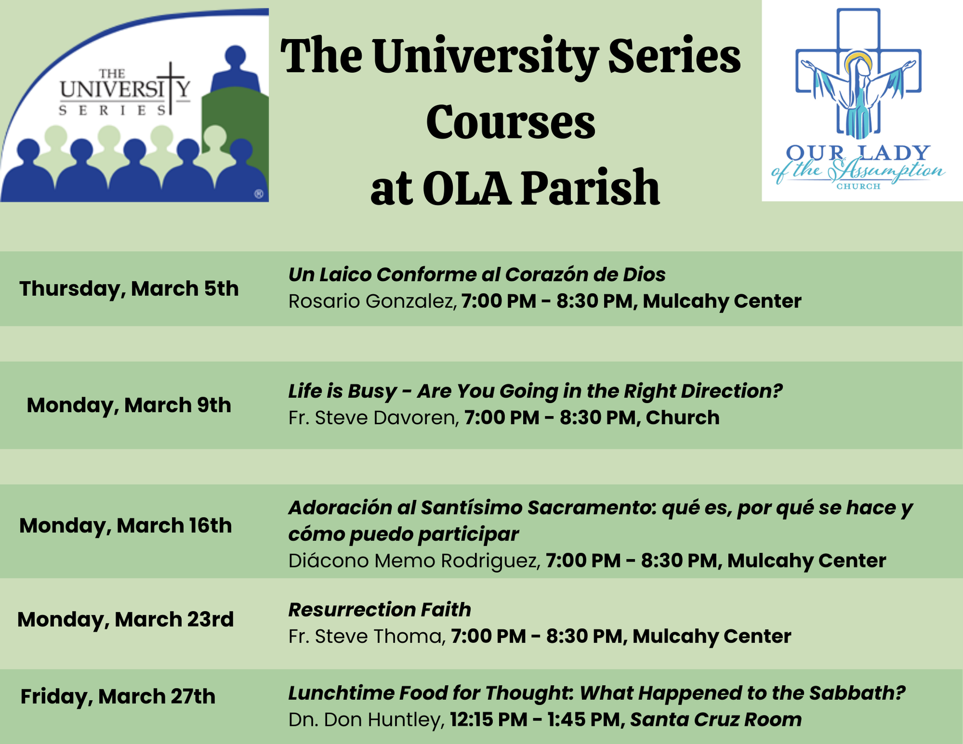 Courses at OLA Parish are listed below. Fr. Leon Hutton's courses at other locations are also listed below.